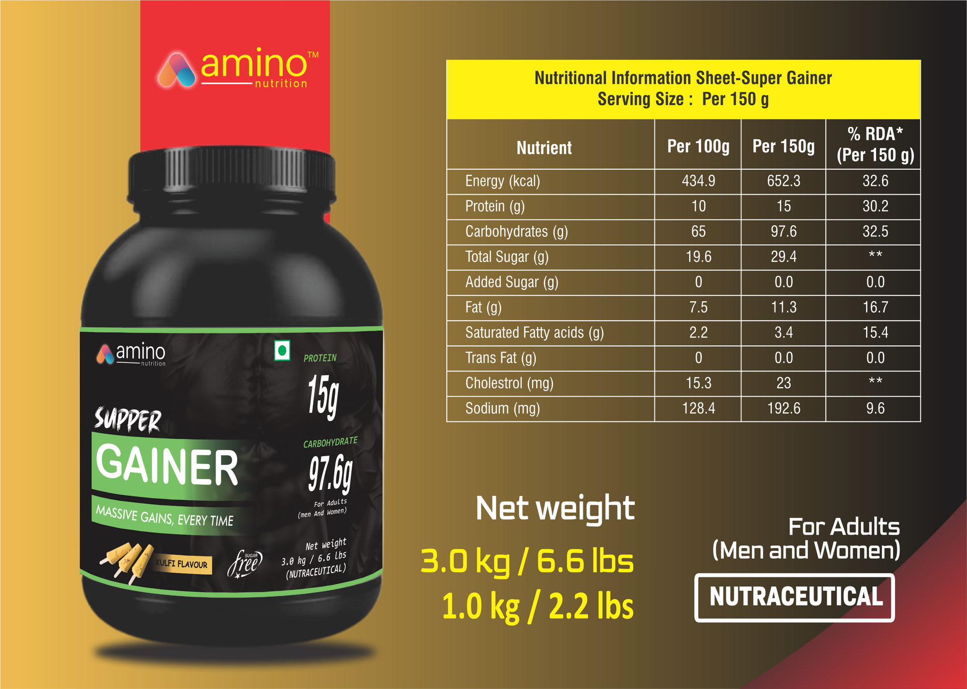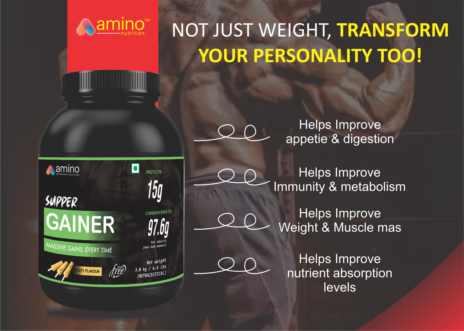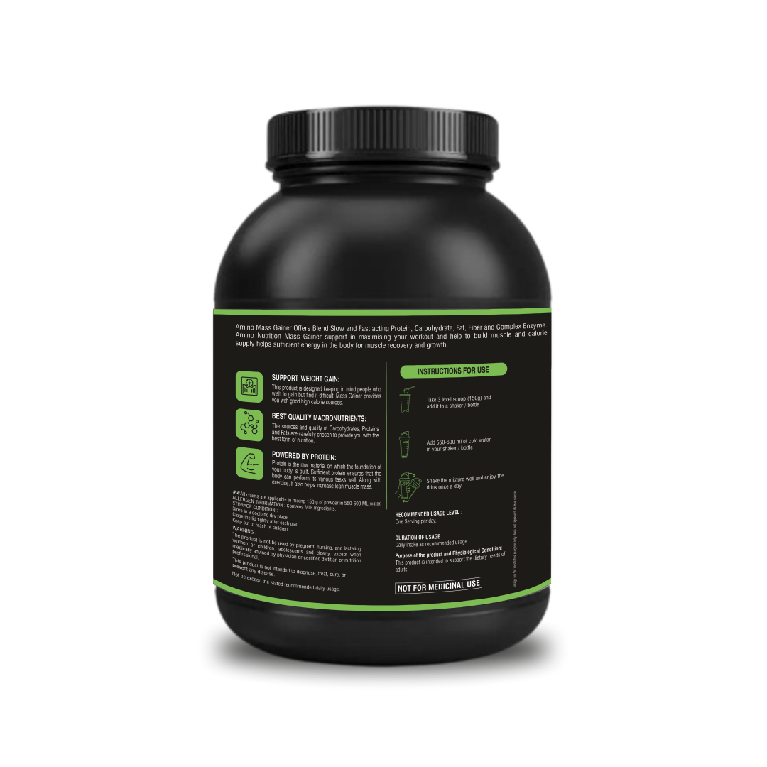Amino Mass Gainer offers a balanced blend of fast- and slow-acting proteins, carbohydrates, healthy fats, fiber, and complex enzymes. Specially designed to support muscle growth, enhance recovery, and deliver sustained energy, it’s ideal for individuals aiming to gain healthy weight and improve workout performance.